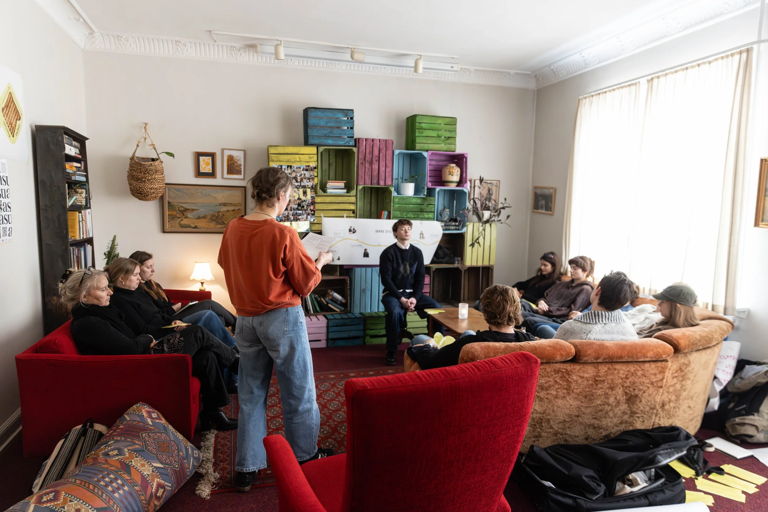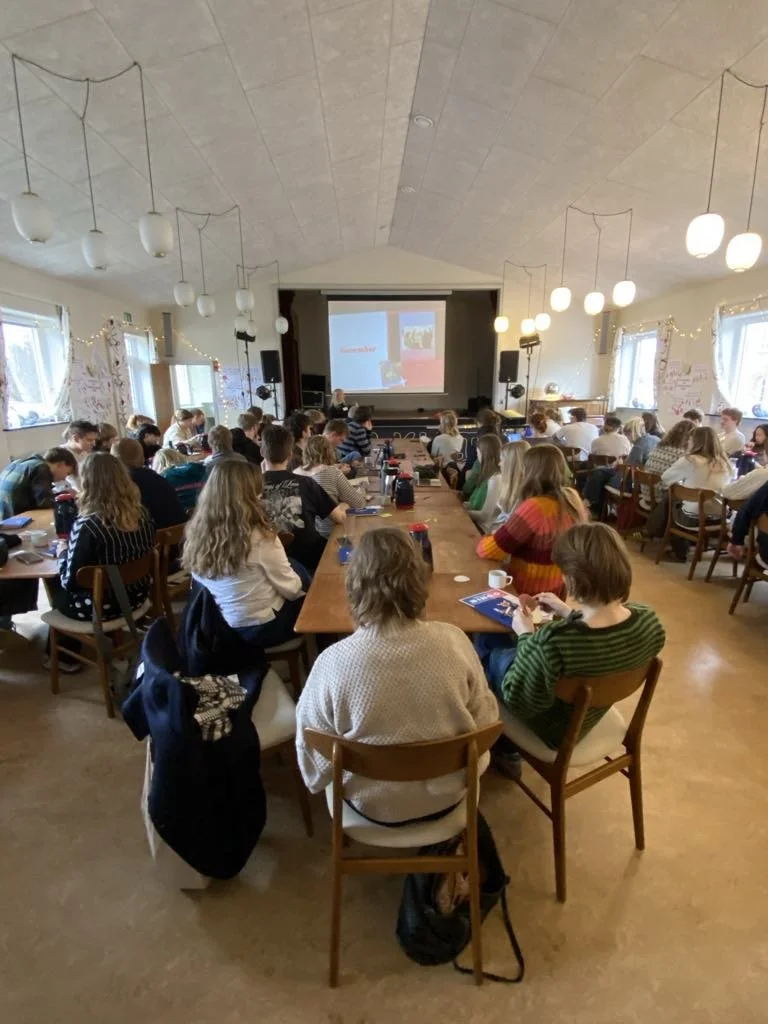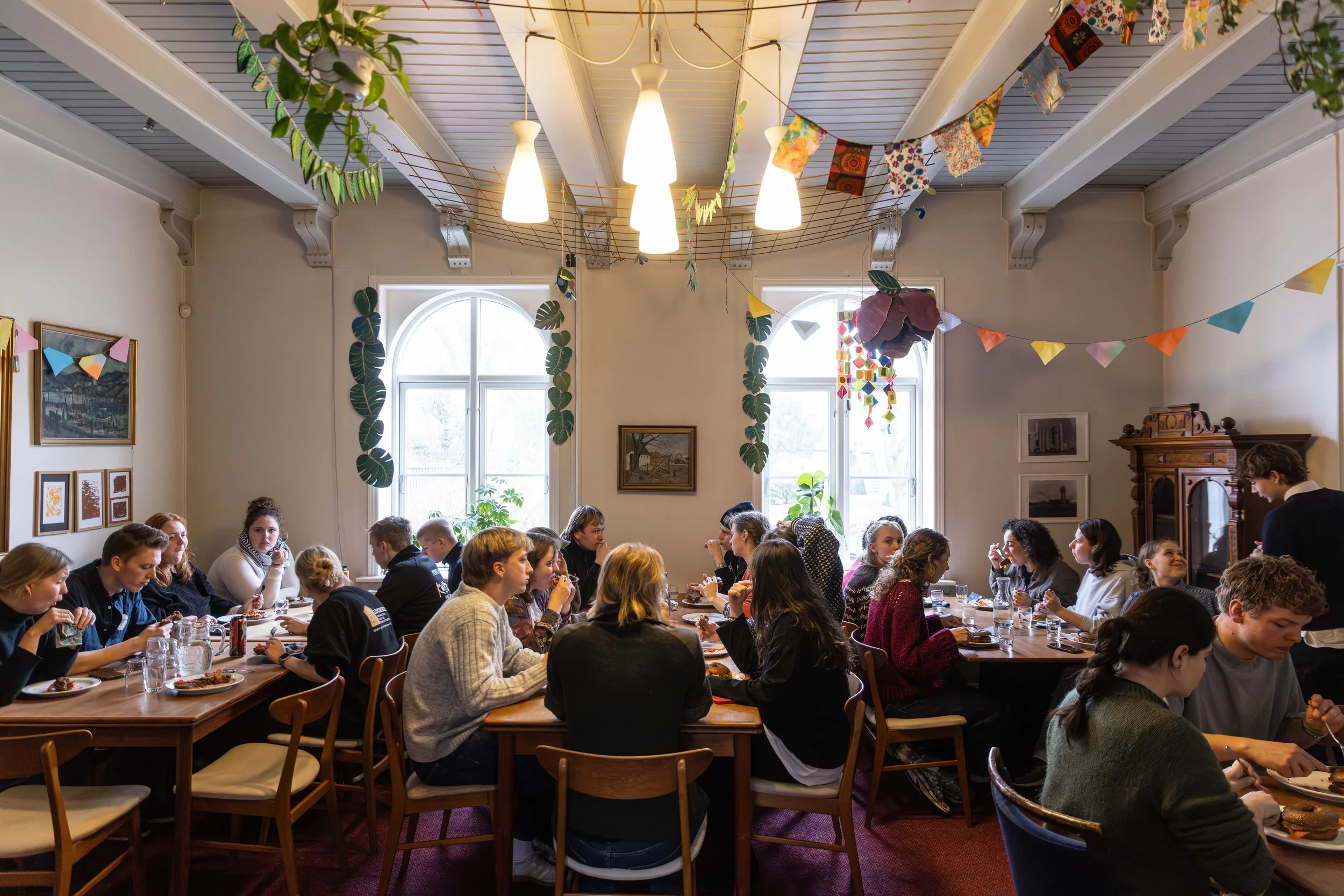 Vi er heldige at have masser af plads. Vi har tre store sammenhængende selskabslokaler / stuer, hvor man kan spise til arrangementer, eller bare sidde og lave lektier, spille brætspil og meget andet.